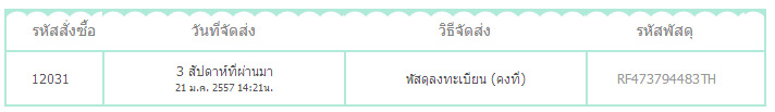 คือยังไงค่ะ แอมเริ่ม งง เพราะแอมจัดส่งสินค้าส่วน ที่ขาดไปให้ เมื่อวันที่ 21 มกราคม 2557 รายละเอียดการสั่งซื้อและสถานะการจัดส่งตามรูปด้านล่างนะค่ะ ซึ่งสินค้าได้ขึ้นสถานะว่าถึงผู้รับ ตั่งแต่วันที่ 24 มกรา ค่ะ รบกวนตรวจสอบให้แอมหน่อยค่ะ :) หรือแอมเข้าใจผิดค่ะ 5555 + รบกวนด้วยนะค่ะ